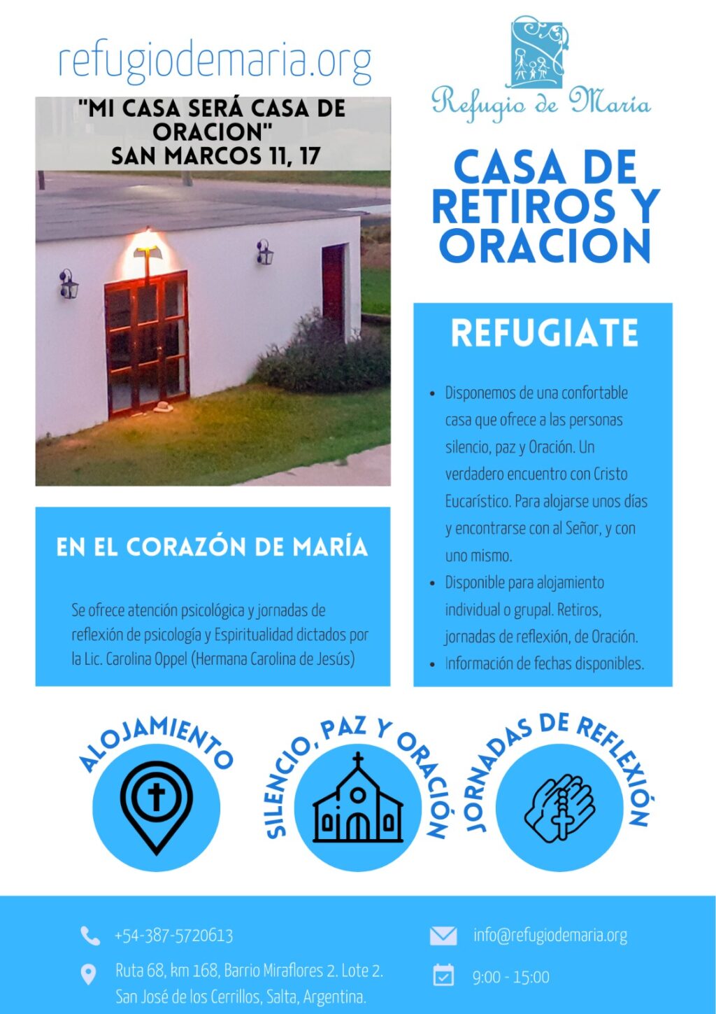 Casa de retiro de la Fundación Refugio de María (pertenecemos a la Iglesia Católica Apostólica y Romana) Disponemos de una confortable casa que ofrece a las personas silencio, paz y Oración. Un verdadero encuentro con Cristo Eucarístico. Para alojarse y tener un profundo encuentro con uno mismo, con la propia historia, con nuestras heridas y presentarse al Señor para ser sanado.